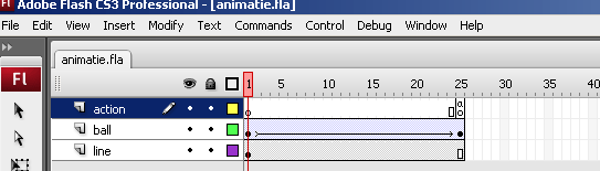 Bovenop het stage panel vind je de timeline. Hier componeer je je animaties. Veranderingen in de animatie geef je aan door middel van keyframes. Je kunt ook meerdere lagen gebruiken, om zo je animatie of interface te structureren en gelaagd op te bouwen. In bijgaand voorbeeld zie je 3 lagen onder elkaar: action, ball en line.